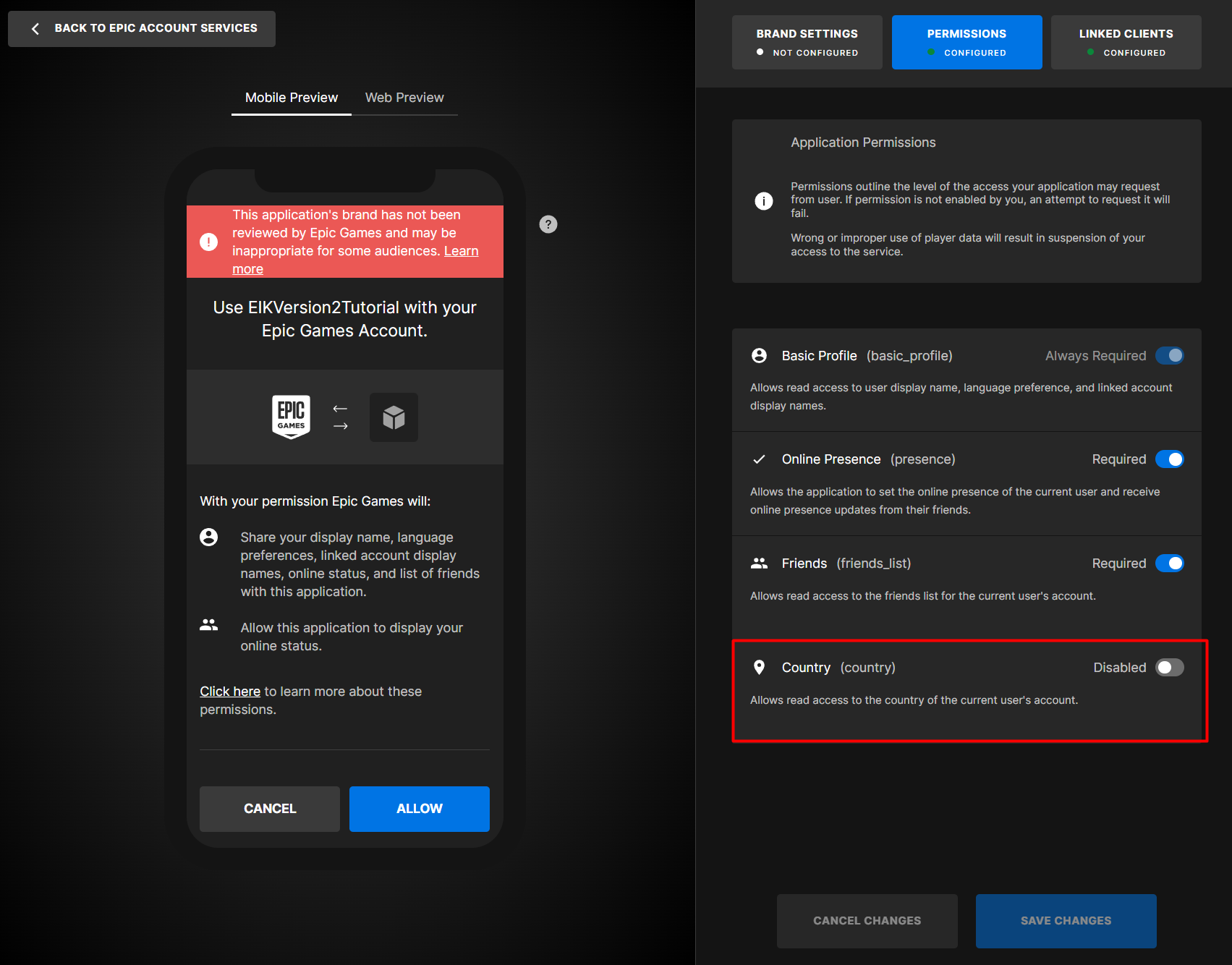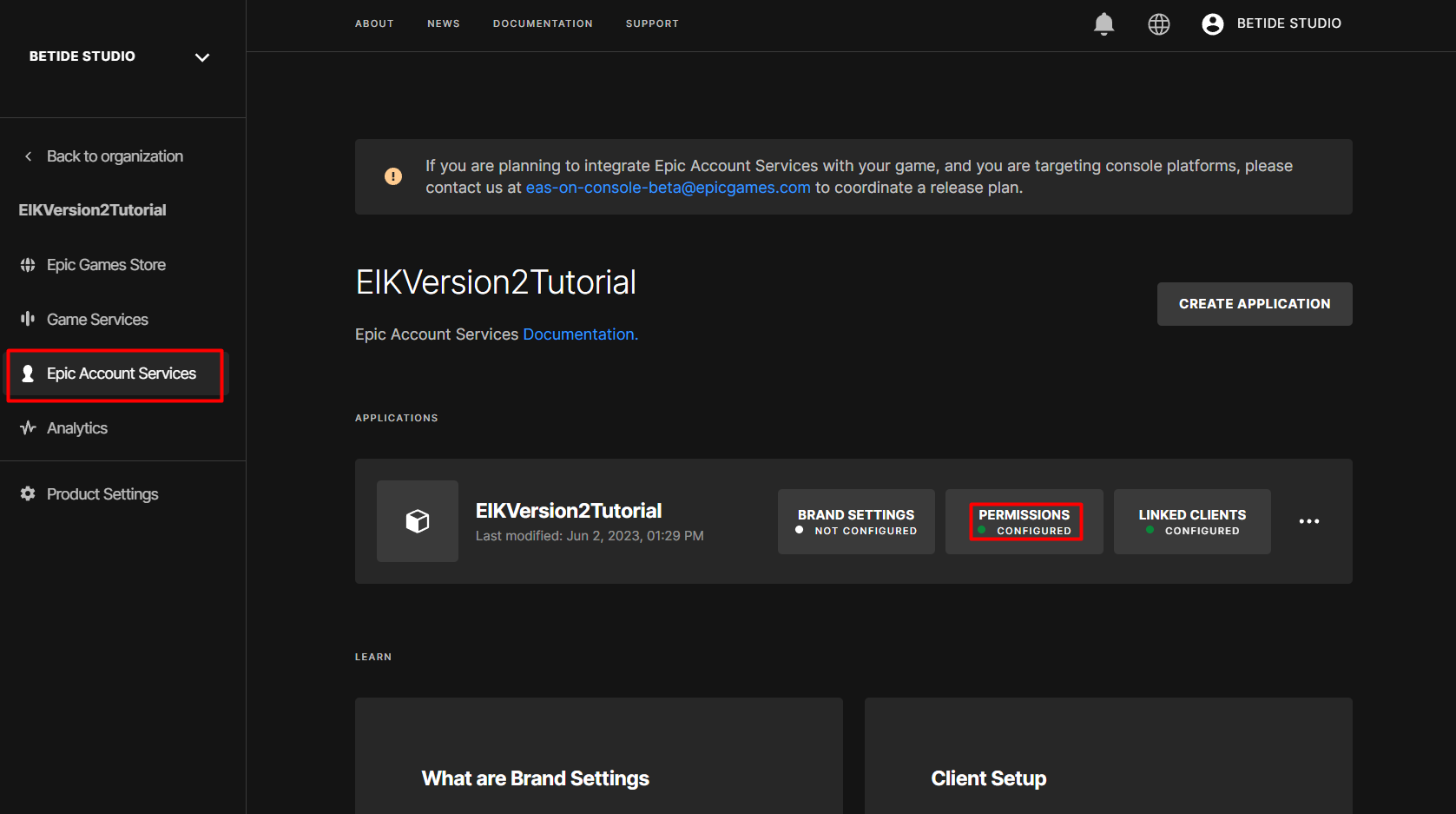 - Go to DevPortal, then select your organization and then go to your product page. On the product page, go to Epic Account Services and then Permissions.