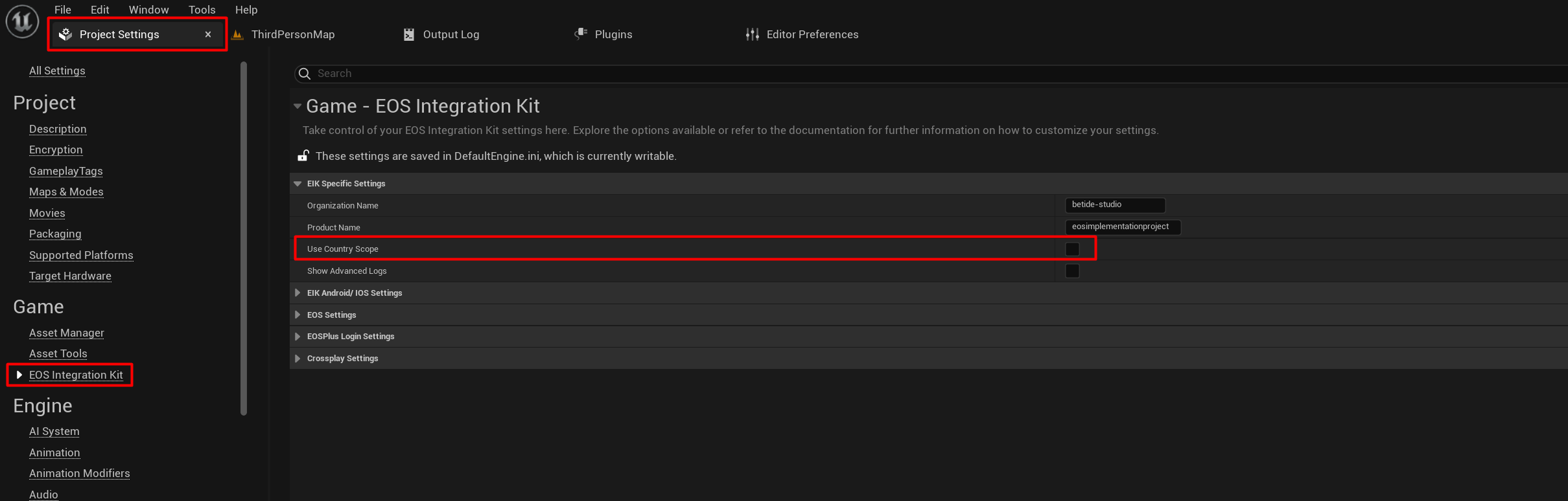 If, for some reason, you want the Country access requirement to be ON, then go the Project Settings, and lastly to the EOS Integration Kit, and turn on the Country Scope.