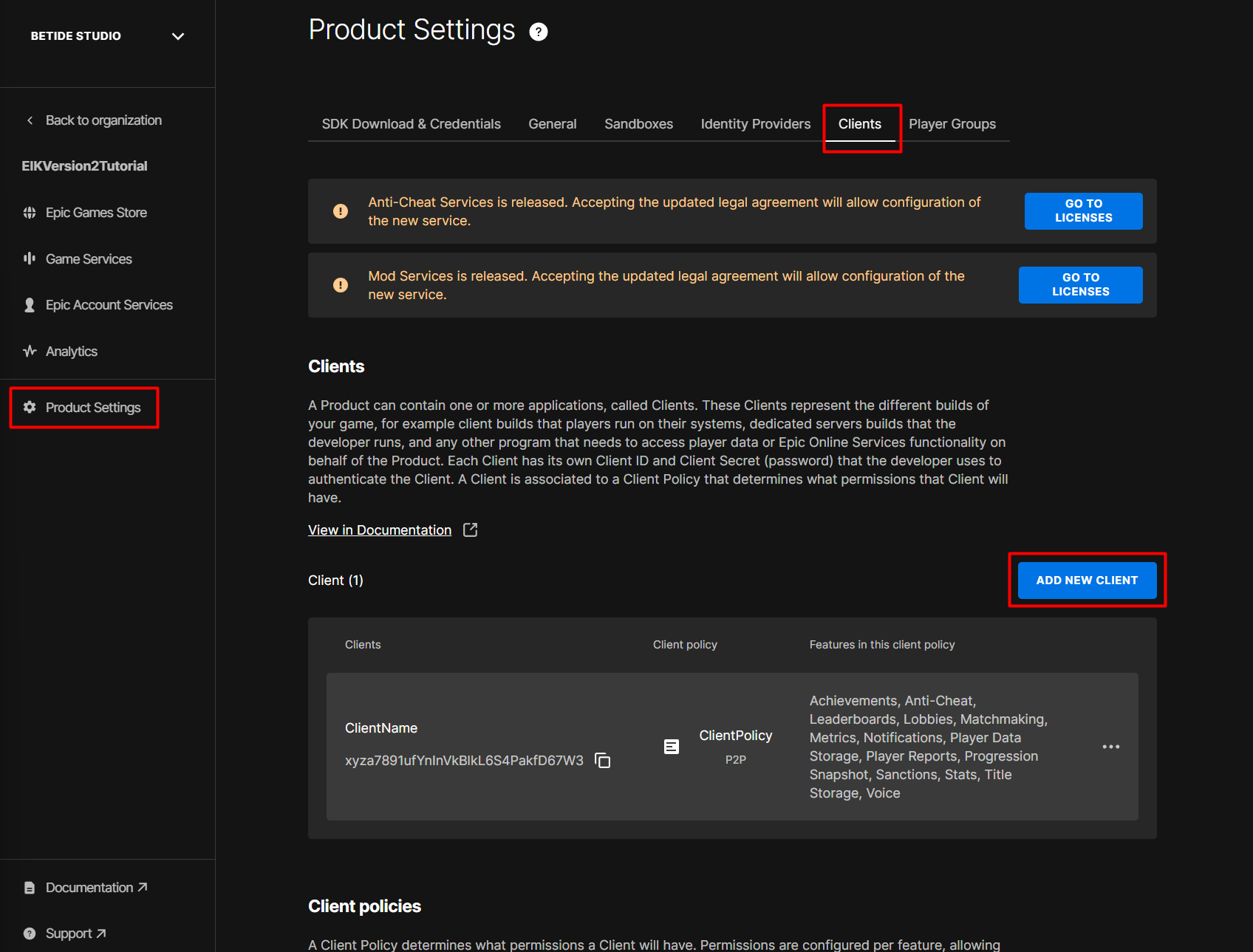 - Go to DevPortal, then select your organization and then go to your product page. On the product page, go to Product Settings and then Clients and lastly press on