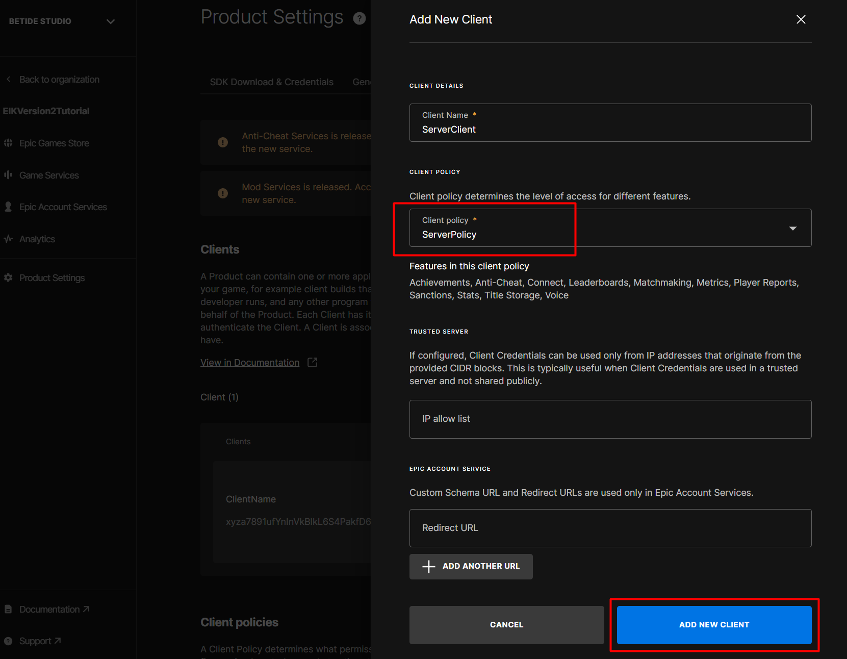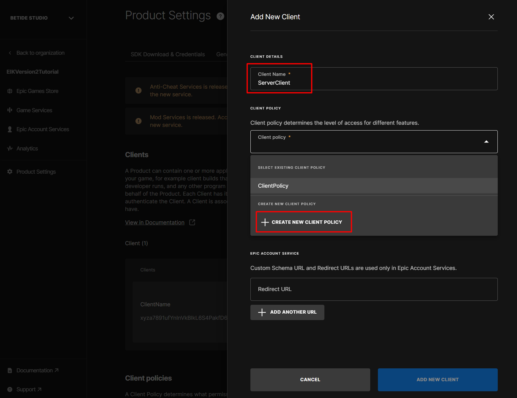Client Namesomething rememberable for Server like ServerClient, and then onClient Policy, selectCreate New Client Policy
